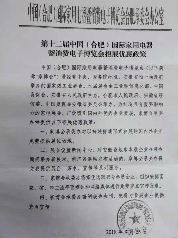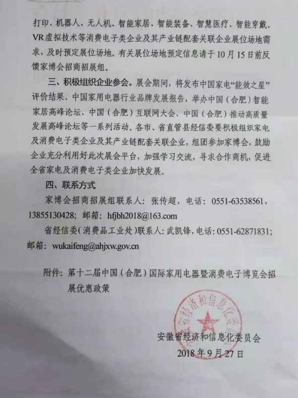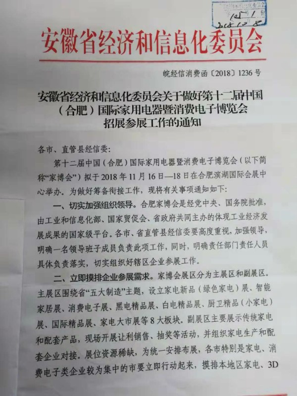 附件:安徽省经济和信息化委员会关于做好第十二届中国(合肥)国际家用电器暨消费电子博览会招展参展工作的通知(皖经信消费函〔2018〕1236号)