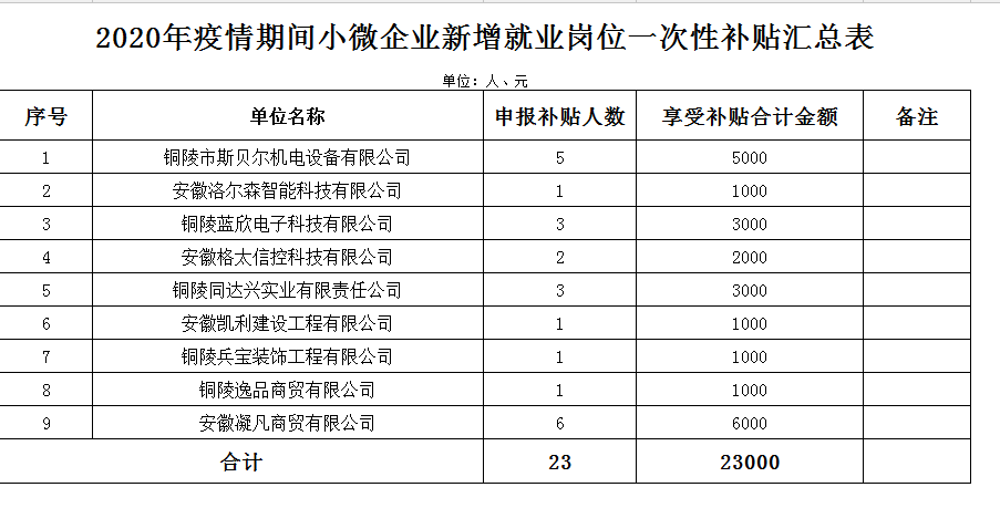 根据市人社局、财政局《关于开展疫情期间企业用工扶持补助申报工作的通知》(铜人社秘[2020]37号)文件精神,经过区人社部门初审,市人社局、财政局审核、审批,铜陵市斯贝尔机电设备有限公司等9家企业符合小微企业新增就业岗位一次性补贴政策,现予公示。公示时间为2020年4月23日至4月28日,公示期间如有单位、个人对所公示的申报单位有异议,请以书面或电话形式向市人力资源和社会保障局就业促进科反映。