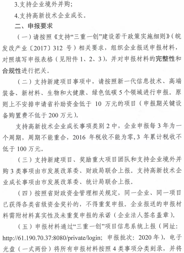 根据《支持“三重一创”建设若干政策》(皖政〔2017〕51号)要求,特制定以下实施细则,本细则适用于在本省内注册企业、单位、个人和建设项目。(1)《安徽省战略性新兴产业“十三五”发展规划》确定领域的制造类项目。(2)项目总投资原则上达到5亿元及以上(包括研发、建筑工程、设备采购费用等,不含土地价款,下同)。对产品技术水平国际领先或填补国内空白的项目,总投资放宽至2亿元及以上,此类项目须提供国家行业协会、检验检测等机构出具的证明材料。(3)已形成实物工作量的在建固定资产投资项目,且须自申报年度起3年内完成总投资。(4)已购置符合《产业结构调整指导目录》要求的相关研发、生产及检验检测等关键设备。(5)项目单位应具备实施该项目的资金、技术等相关能力。(1)市(指省辖市,下同)发展改革委、财政局联合上报的文件。文件中应附项目曾获得各级财政资金支持明细。(二)项目的基本情况,主要包括建设背景、建设地点、建设内容、技术工艺、总投资及资金来源,以及各项建设条件落实情况等;(三)技术工艺情况。包括技术工艺创新点、主要指标与国内外同类技术产品比较、知识产权情况等;(四)产品市场调查和需求测算;新增投资估算和资金筹措;经济社会效益分析。(4)环保、规划、土地、节能审查部门出具的相关批复文件。(8)项目《固定资产投资发票明细汇总表》(按土地、设备购置及厂房建设等分类明细)。(9)上一年度1月1日至当年申报截止时间内购置关键设备的发票及银行划款凭证。(10)企业及企业法人代表对申报材料的真实性承诺,及不重复申报的承诺。(11)申报“一事一议”方式支持的项目,须同时报送省市“一事一议”支持建议方案。(1)对经审核通过的项目,按对关键设备购置进行补助,补助比例为购置金额的5%。(2)同一项目已获得过相关省级财政资金支持,兑现差额部分补助资金。曾获得过2015、2016年度省战略性新兴产业集聚发展基地专项引导资金支持的,按照应补助金额扣除已获得支持金额的差值进行补助。(3)单个项目的获得补助的次数原则上不超过两次,补助金额累计最高不超过3000万元。(1)《安徽省战略性新兴产业“十三五”发展规划》确定领域的制造类项目。(2)至申报截止日前3年内累计实际投资达到10亿元以上(不含土地价款)。(4)环保、规划、土地、节能审查部门出具的相关批复文件。(5)会计师(审计师)事务所编制的项目竣工决算报告(投产时提供)。对项目企业管理技术团队和项目招商团队分别给予奖励:10亿元及以上、30亿元以下的,各奖励100万元;30亿元及以上、50亿元以下的,各奖励200万元;(1)本省企业和并购的目标企业须属于战略性新兴产业制造类领域。(2)至申报截止日前3年内完成资产交割,获得目标企业的所有权或经营管理控制权。(3)并购获得的新技术符合《国家重点支持的高新技术领域》。(1)市发展改革委、财政局联合上报的文件。文件中应附项目曾获得各级相关财政资金支持明细。(5)最终控制方证明、保密协议、资产评估报告及聘请的律师方出具的并购证明材料。(6)并购合同副本(签约双方、并购方式及内容、并购金额、签约时间、签字页等,其中,商务条款需翻译成中文)。(7)外汇汇出核准文件,资金汇出证明或相关具有法律效力的证明。(9)环保、规划、土地、节能审查部门出具的相关批复文件。(12)企业及企业法人代表对申报材料的真实性承诺。(2)同一项目已获得过相关省级财政资金支持,兑现差额部分补助资金。(3)单个项目的补助资金原则上为一次性安排,补助最高可达3000万元。(2)基地依照评估指标体系(评估指标体系另行制定)编制的自评报告及相应证明材料。(4)第三方机构评估需要的其他材料(评估时提供)。评估得分70分及以上、80分以下的,奖励3000万元;评估得分60分及以上、70分以下的,奖励2000万元;重大新兴产业工程是重大新兴产业基地的后备力量,已掌握关键核心技术、实现产业化且具有一定发展基础,通过3年左右时间,能够培育成战略性新兴产业。(2)在上一年度1月1日至当年申报截止时间内,购置与重大新兴产业工程建设内容相关的研发、生产设备。(2)重大新兴产业(试验)工程建设工作总结(含工程总投入、既定任务目标完成、技术产业化、核心项目建设进展、市级政府支持等内容)。(3)研发、生产设备清单(清单须含购置研发和生产设备的型号、数量、单价、时间、地点、用途及使用情况。附采购合同、税务发票、海关报关单(可选)、进厂验收单(可选)、使用现场照片。(4)会计师(审计师)事务所出具的重大新兴产业(试验)工程研发、生产设备购置费用的审计报告。(5)项目承担单位及单位法人代表对申报材料的真实性承诺。(1)对经认定的研发、生产设备购置进行补助,补助比例为设备购置金额的10%。(2)对重大新兴产业工程,补助最高可达3000万元;对重大新兴产业试验工程,补助最高可达2000万元。重大新兴产业专项是重大新兴产业工程的后备力量,已掌握关键核心技术、即将实现产业化且具有一定的创新研发基础,通过5年左右时间,能够培育成战略性新兴产业。(2)在上一年度1月1日至当年申报截止时间内,开展了与重大新兴产业专项建设内容相关的产品研发、样机试制和检验检测活动。(1)市发展改革委、财政局联合上报的文件(含重大新兴产业专项建设进展,产品研